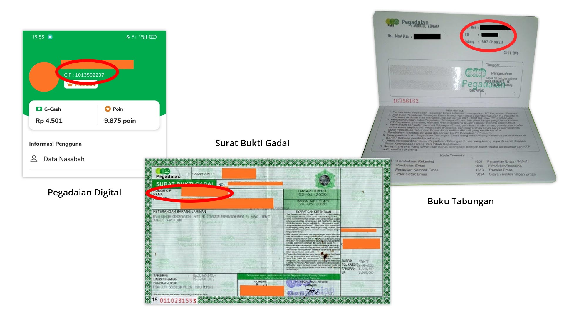 Bagi nasabah harus melampirkan No. CIF atau nomor nasabah (No. CIF dapat dilihat di kertas SBG, Buku Tabungan Emas dan Aplikasi Pegadaian Digital - Klik disini untuk melihat contoh CIF)